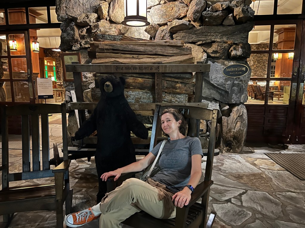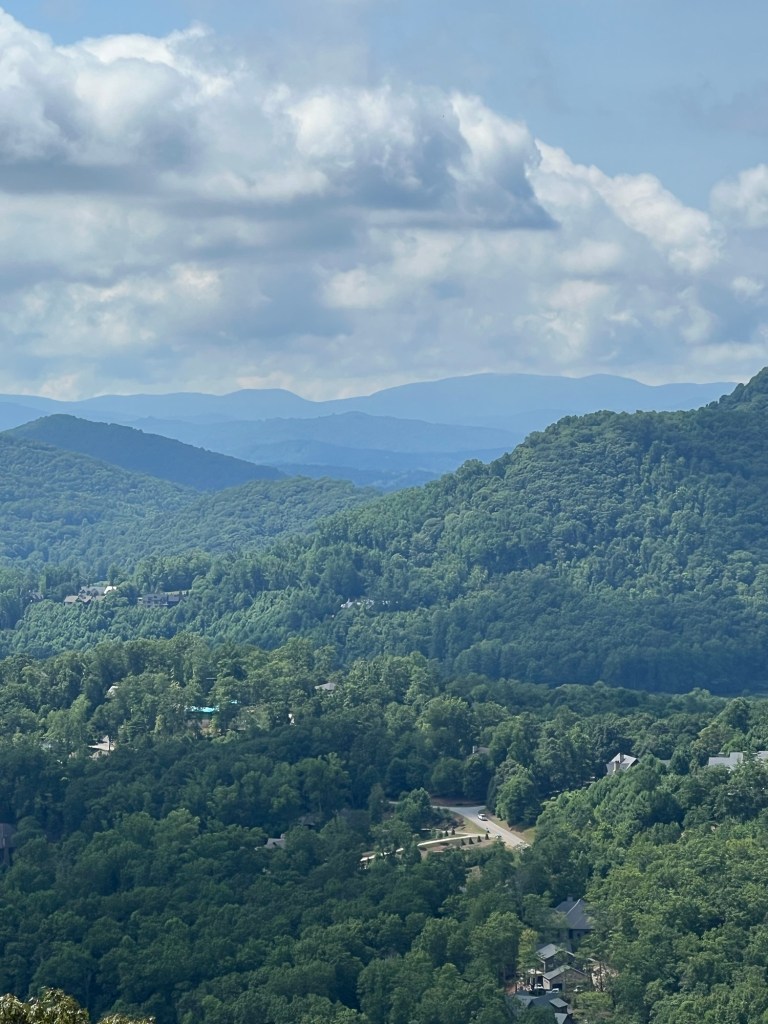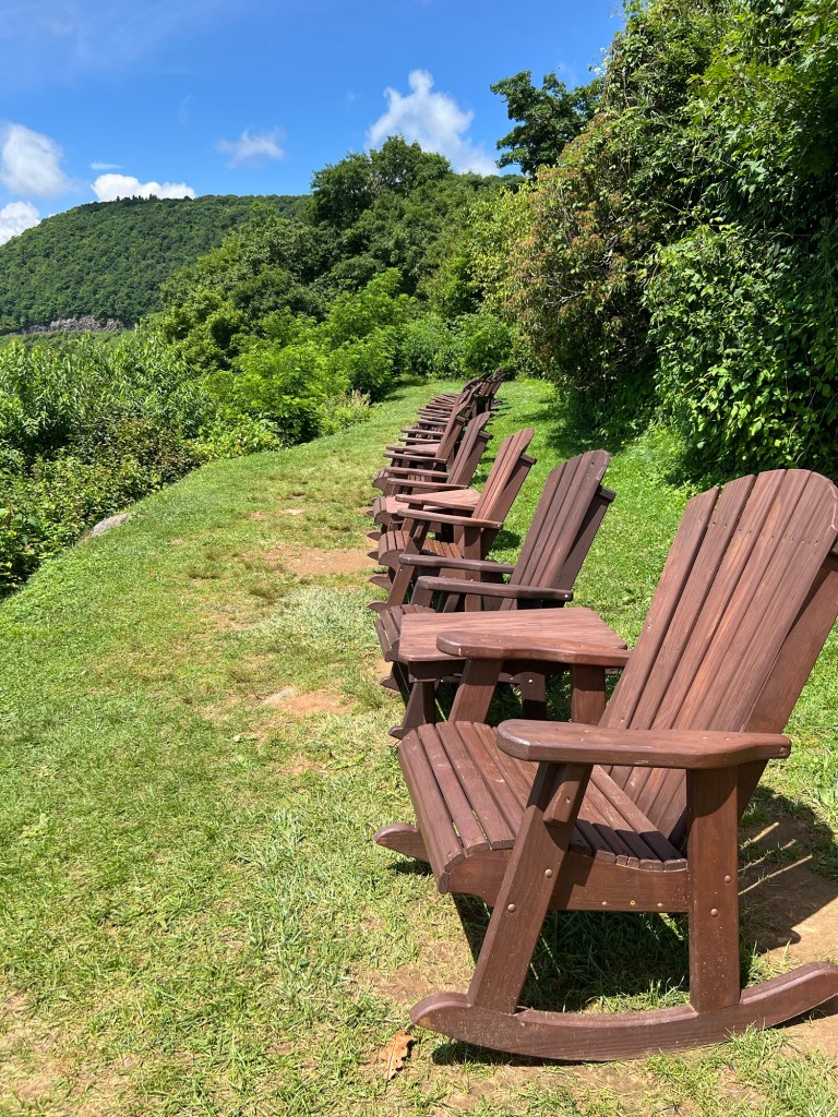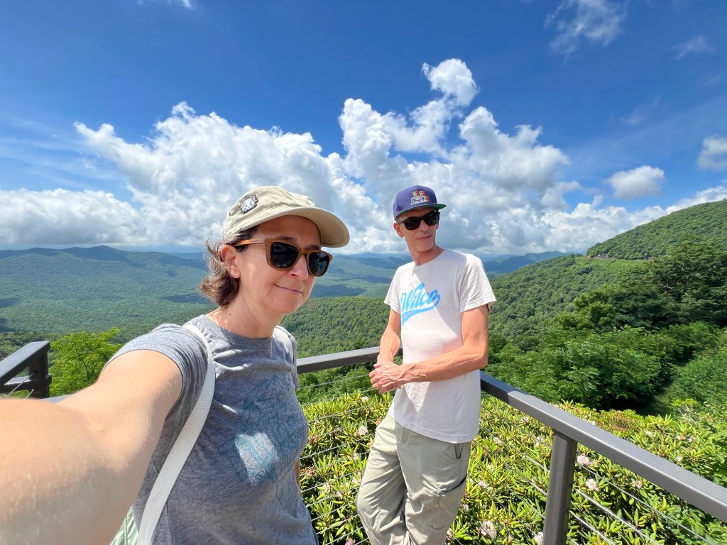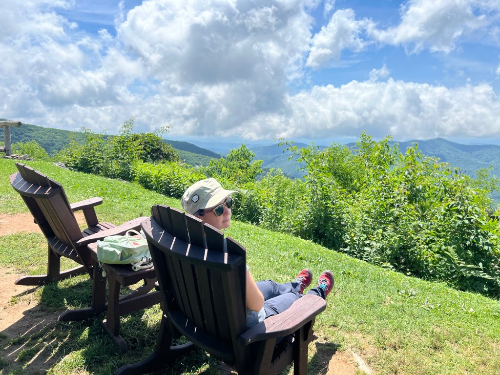 After a bunch of swirly roads we made it to Mount Pisgah. There was a hotel and restaurant up there but we found a bunch of rockers to sit on and have our morning tea with views across the mountains.