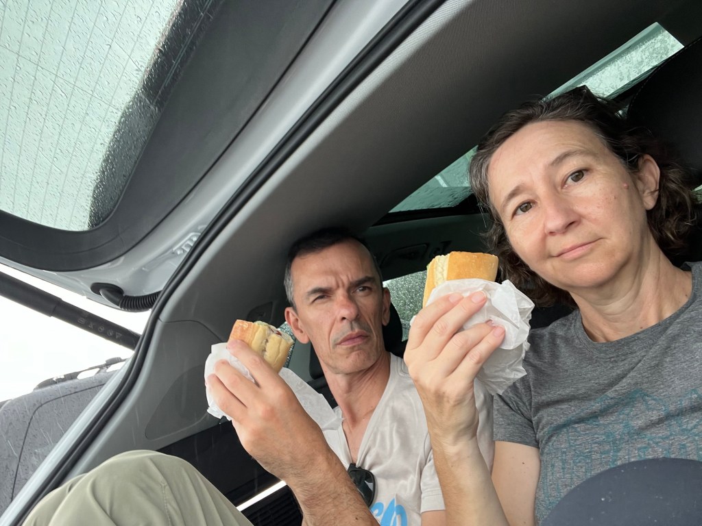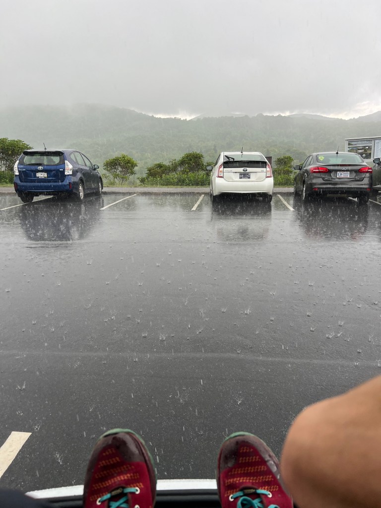 As we ascended the last steps to the car park we felt a feel drops of rain. By the time we got to the car it was absolutely bucketing with rain. We have come to learn that that is what happens here come early afternoon. Luckily we were at our car. Some hikers that had passed us who were just setting off – not so lucky. We took shelter in the trunk (boot) of the car. The rain was actually quite nice to watch and we were also able to see all the hikers coming back up the steps totally soaked. We decide to eat our sandwich right then and there in the trunk of the car. It was lunch time after all and we didn’t what to drive off in the heavy rain.