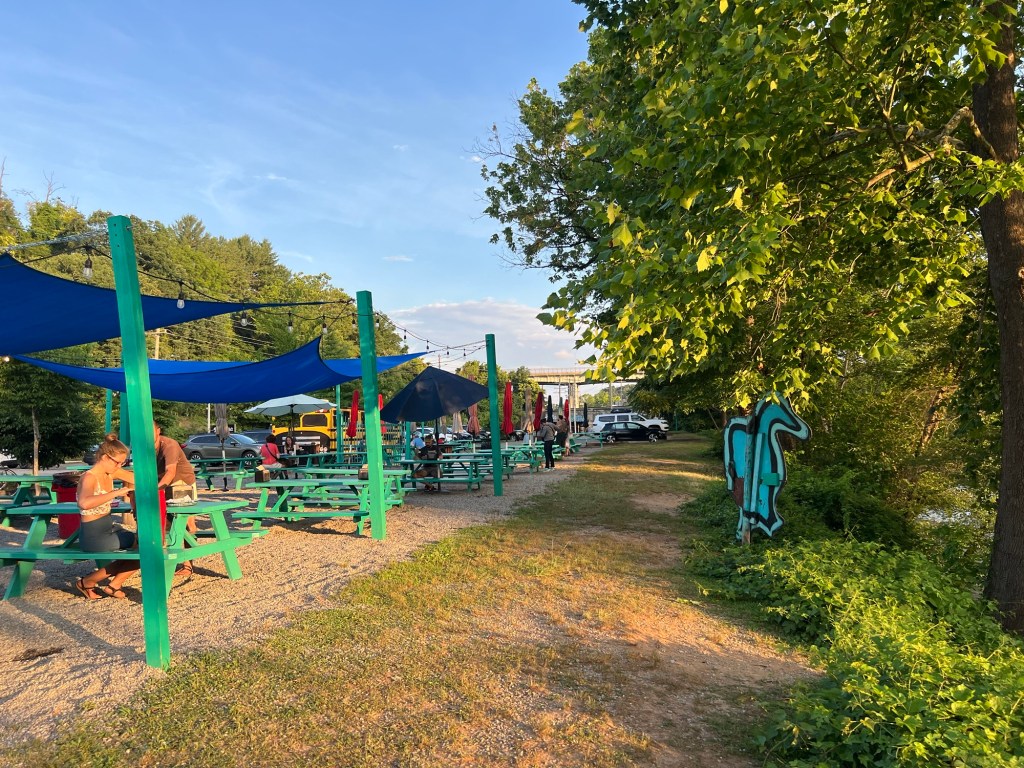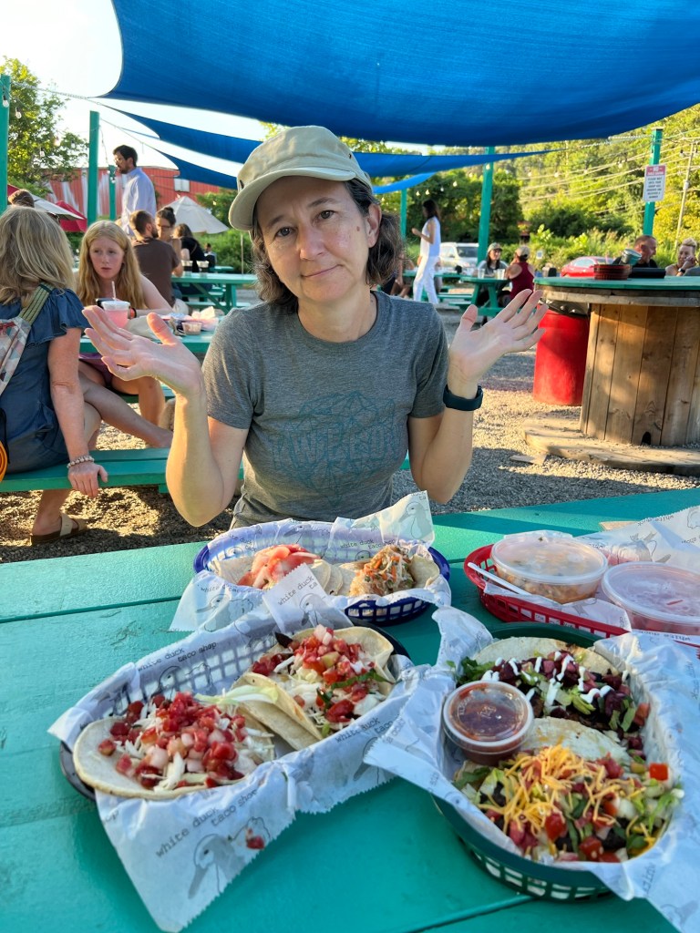 Ok we need to get back to Asheville now. Too many things to see around here. As we had the car we planned to get dinner at a Taco place which was a bit out of walking distance from our hotel. White Duck Tacos – down by the river. There was a long line when we got there, but it moved quite quickly. They have loads of bench seating outside and it was a nice a warm evening so we sat out there to enjoy our tacos, which were delicious Btw. Particularly the Tofu banh mi one.