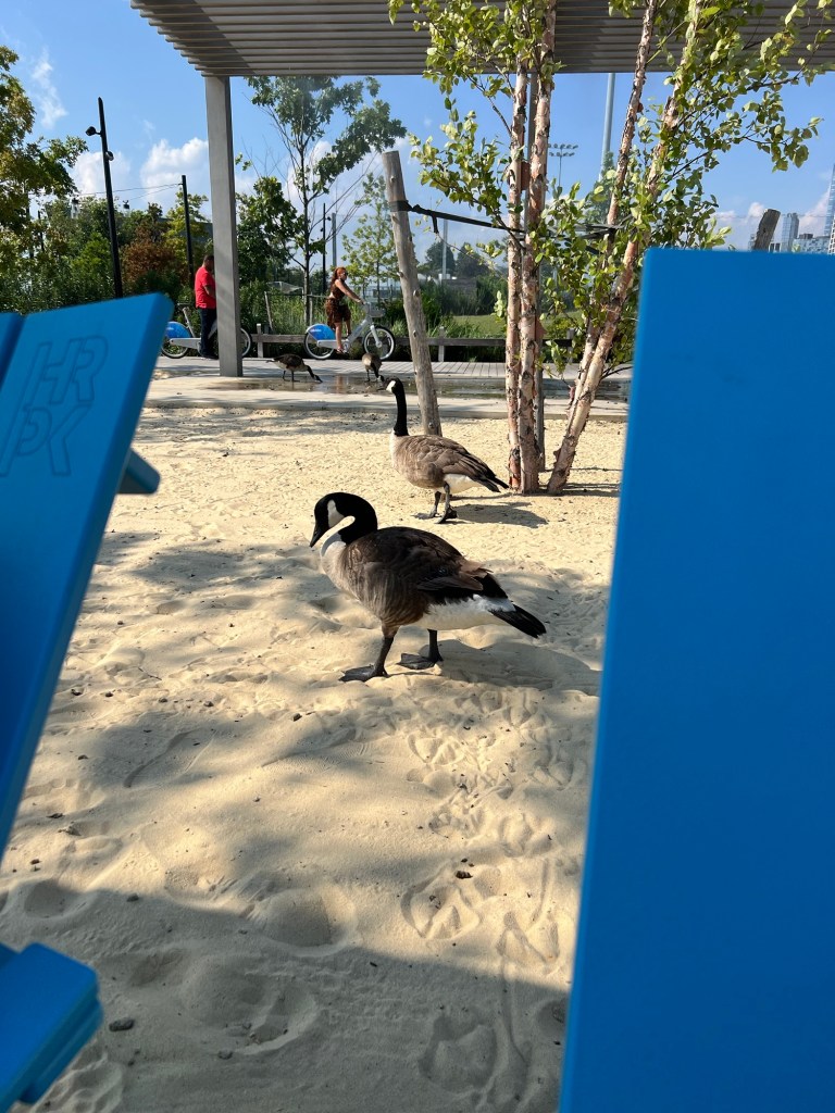 We wandered down to the river hoping it’d be a little cooler there. It wasn’t. In fact I think it was hotter. We found this little man made beach area with chairs under umbrellas and sat there for quite a while and almost fell asleep – it had been a long day after all. There were all these geese hanging around trying to get cool too.