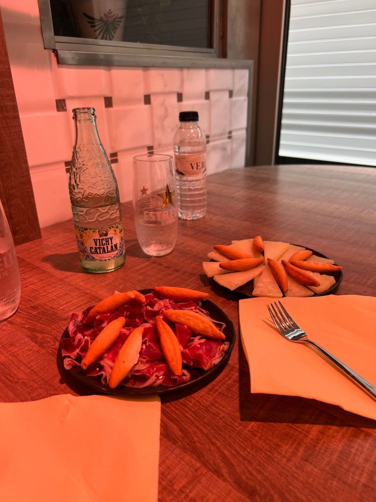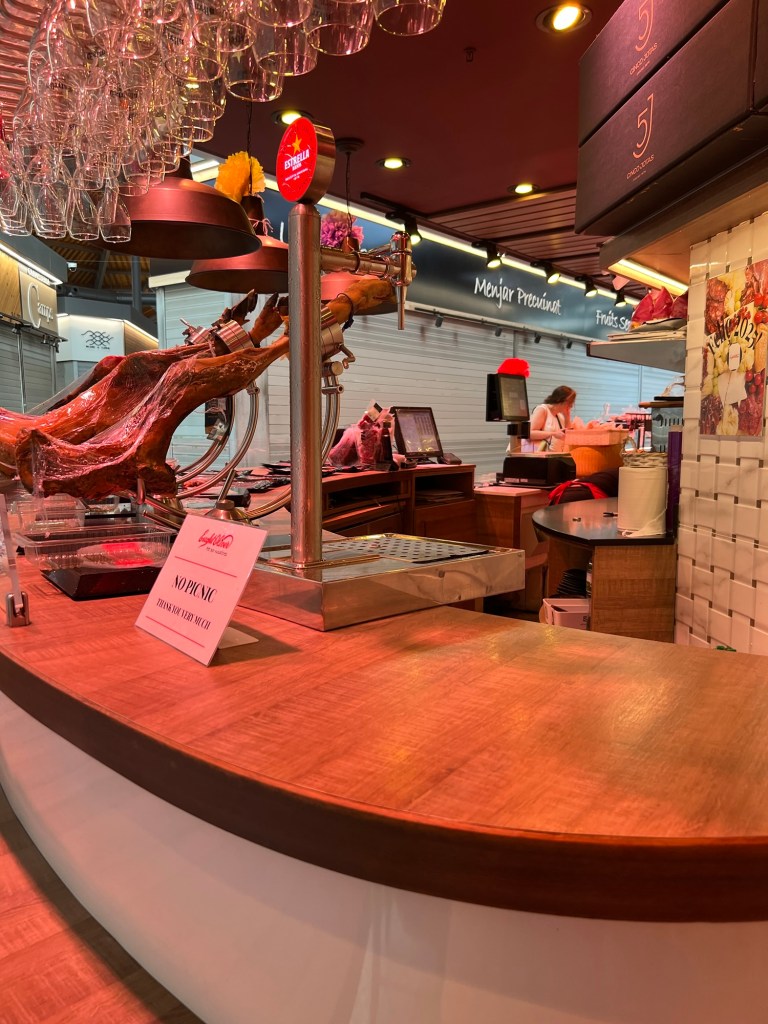 It was an interesting if somewhat warm walk but we found the market. Unfortunately most of the stalls inside were closed already as it looked like it would have been good. We were getting hungry as we hadn’t had lunch and it was like 4pm by now so we saw this place with Iberico hams and decided to stop there. They had run out of most things for the day but we were able to order some Ibercio ham and Manchego cheese and some mineral waters. Note: our Spanish is very poor, we need to improve this.