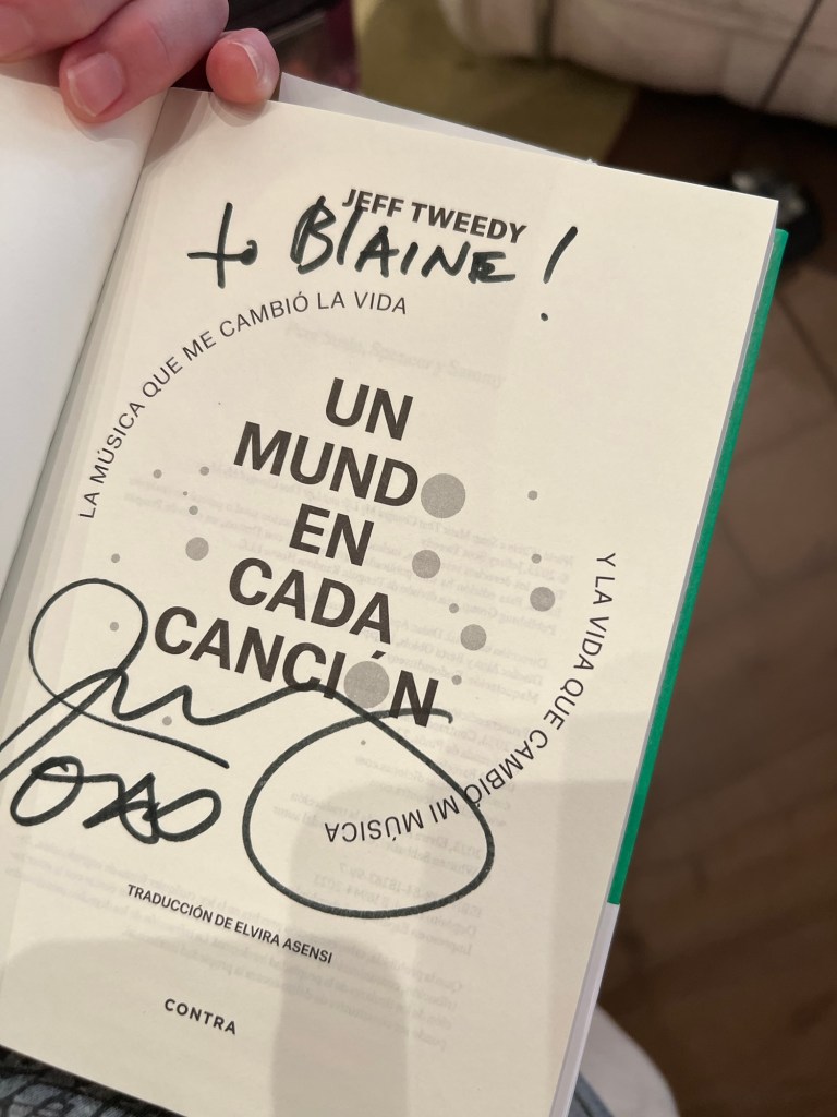 We got in there and sure enough, there was Jeff signing away. Without hesitating I bought a copy of his book – in Spanish – and lined up to get it signed. And next thing I know Jeff was signing my book and I was telling him Wilco never come to Perth.