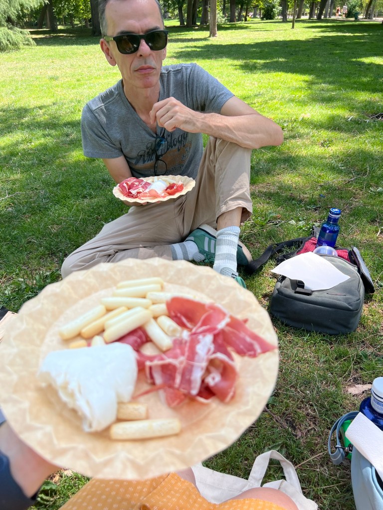 We went to a produce store called “The Spanish Farm” to see if they had any good produce to buy. Yeh they did. I got a bunch of things and then the guy in the shop convinced us to buy some things to eat for lunch as a picnic. “We have plates” he says, and proceeded to produce plates, cups, cutlery, napkins – all for free – how could we resist. We bought some Iberico, cheese, olive oil and headed off to nearby Retiro Park to enjoy.