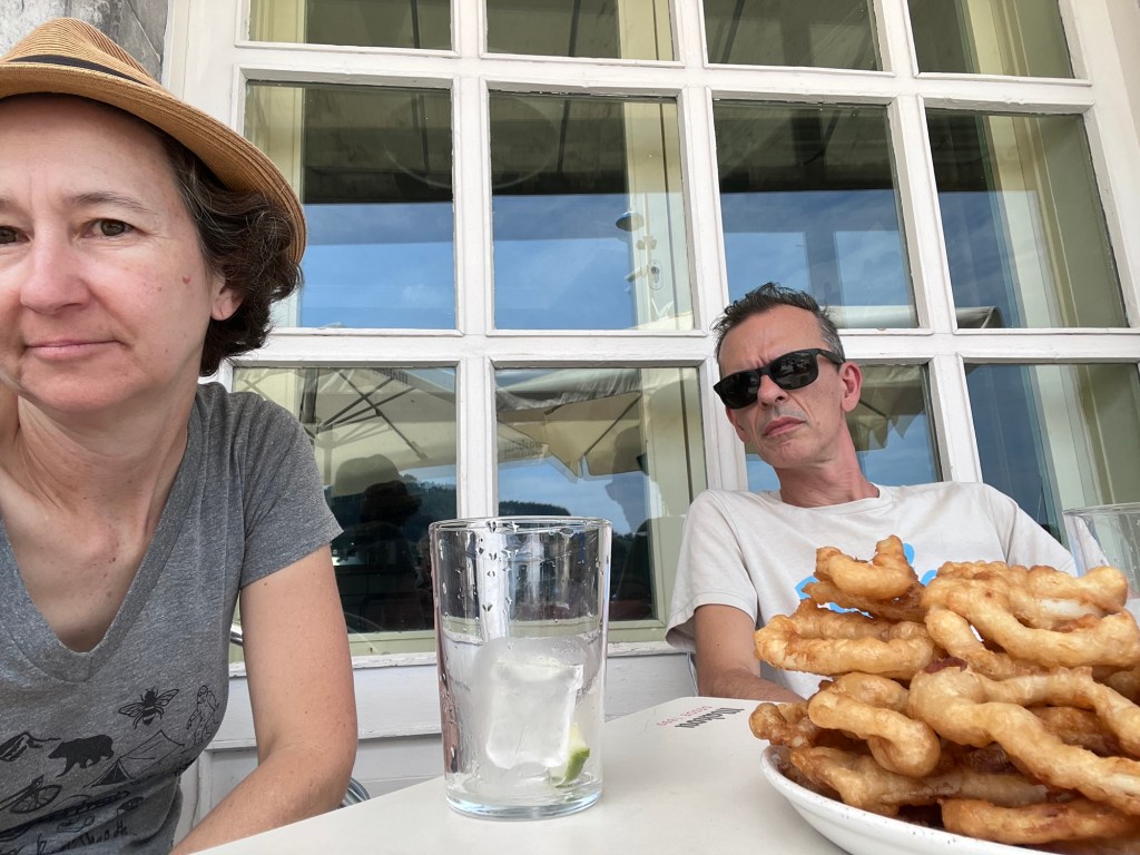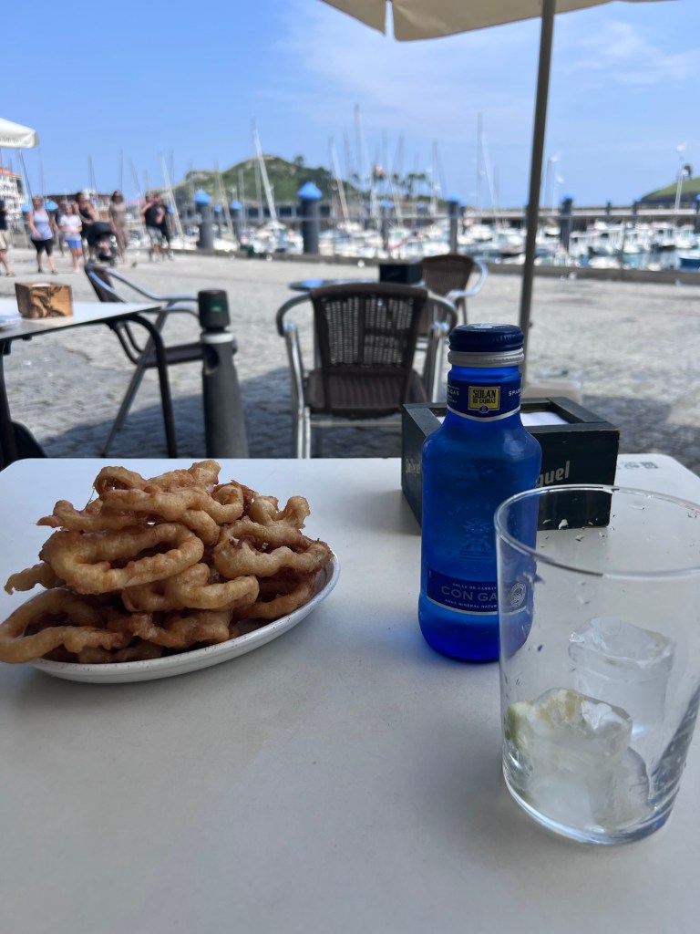 There were lots of restaurants and cafes around and as we walked along looking at them all – the stand out dish seemed to be the fried calamari. We found a place that had spare chairs and sat down and wondered how to order. There were no menus inside or outside. The kid that came to take our order spoke only Basque. We pointed at someone else’s calamari and asked for “dos agua con gas”. We got 1 Agua con gas and the calamari, but I managed to order another second Agua in the end. The calamari was crispy and tender.