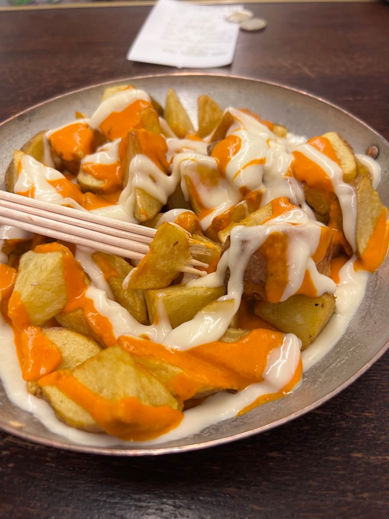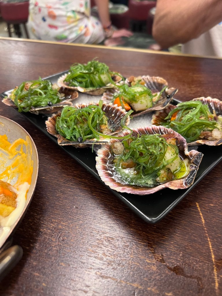 We needed dinner by this stage, and Old Town is were most of the pinxtos bars are, and again it was insanely busy….its always a bit disorienting arriving in a new city. So we just chose a random place to go into – there was a table free so we took it. I was determined not to eat bread for tonight’s dinner so after some initial confusion on how to order, we got the Patatas Bravas and some scallops.